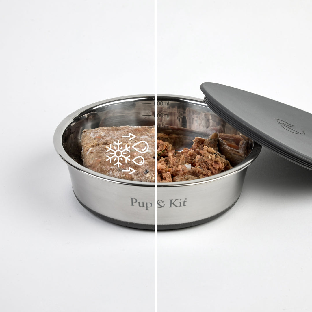 Mealtimes made easy! Introducing the Lid-it® Pet Bowl by Pup & Kit...a unique, quality stainless steel bowl with airtight silicone lid. The perfect solution for keeping your dog or cat food fresh, as a travel dog bowl or for preparing meals in advance.