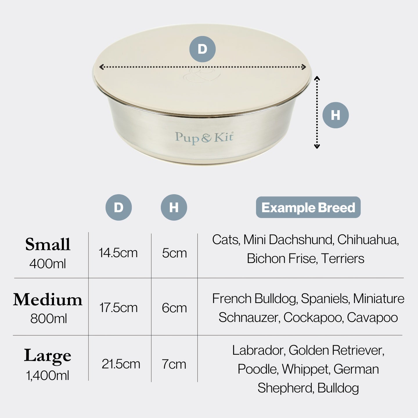 Medium (800ml): French Bulldog, Spaniel Breeds, Miniature Schnauzer, Dachshund (Standard), Cockapoo, Cavapoo, Pomeranian.